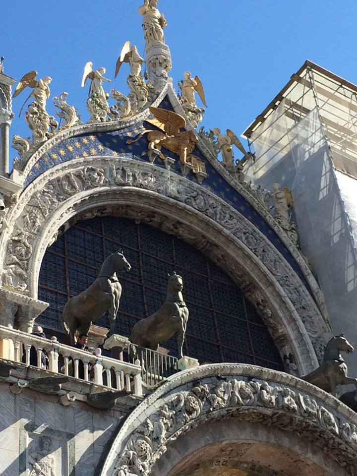 A small portion of the intricate exterior of Saint Mark’s Basilica in Venice.